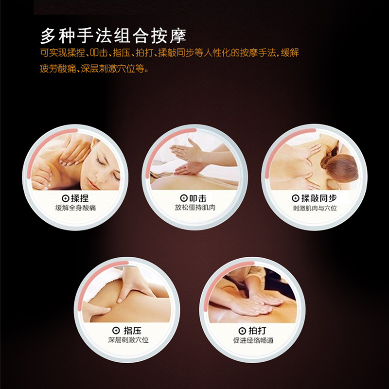 采用專利東方手感超薄按摩機芯,力度更加細膩、柔和,可對人體不同部位進行揉捏、叩擊、指壓、拍打等數十種組合式手法按摩,真正實現人手般按摩體驗。